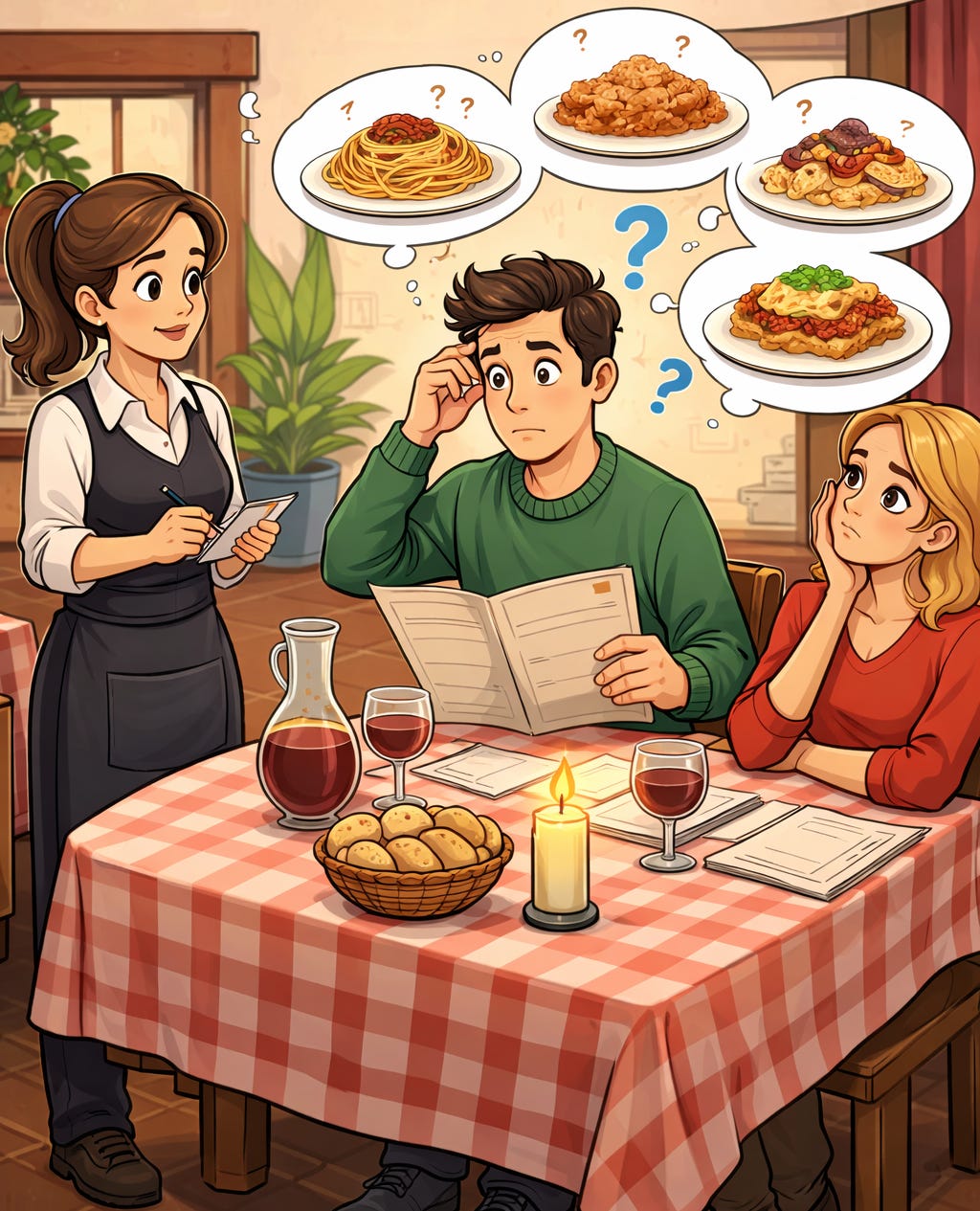 Quando la cameriera è ritornata al nostro tavolo per la terza volta, Marco continuava a tergiversare, non riusciva ancora a scegliere un primo piatto per la cena.
